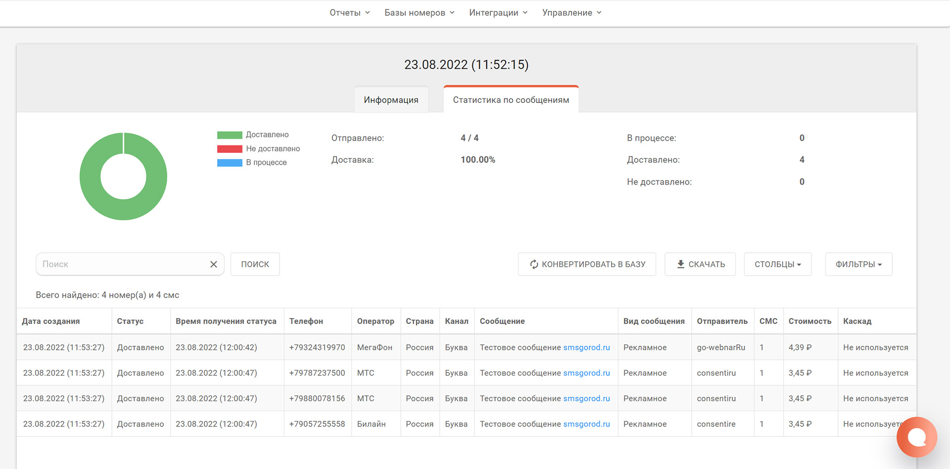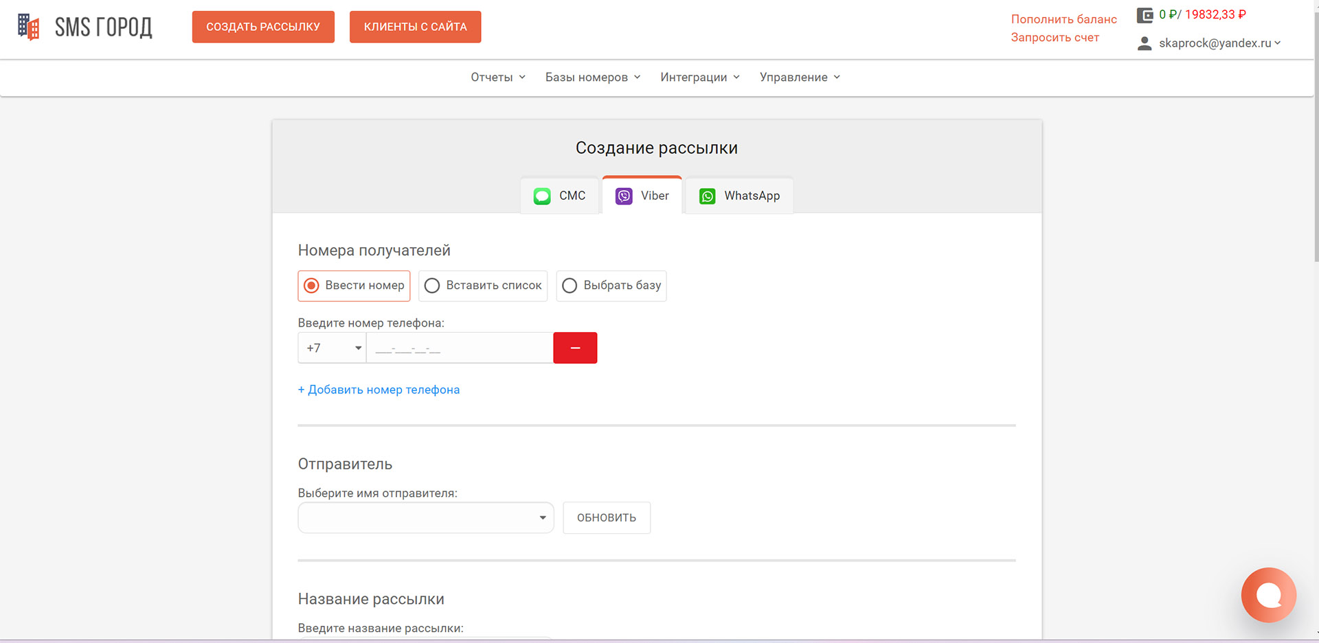 Сервис работает с 2013 года. Позволяет делать рассылки СМС, WhatsApp, Telegram и ВК. Десятки готовых решений для отправки СМС из CRM, различных программ и сайтов.