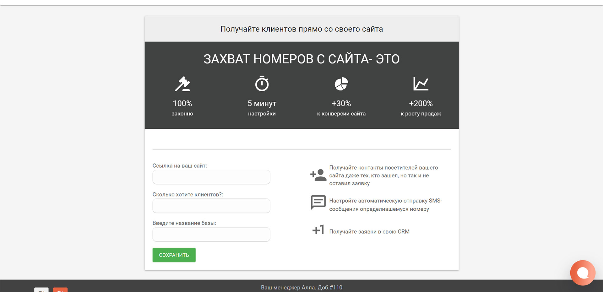 С помощью сервиса так же есть возможность получать данные тех, кто зашел на сайт, но не оставил заявку. Это позволяет сразу же отправить СМС посетителям сайта и повысить конверсию.